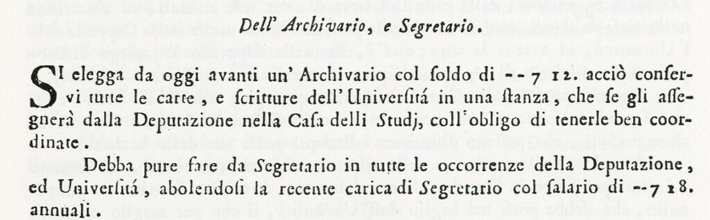 Nella riforma del 1779 venne introdotta fra gli ufficiali dello Studio la nuova figura dell’archivario “acciò conservi tutte le carte e scritture dell’Università in una stanza nella Casa delli Studij, coll’obbligo di tenerle ben coordinate”.